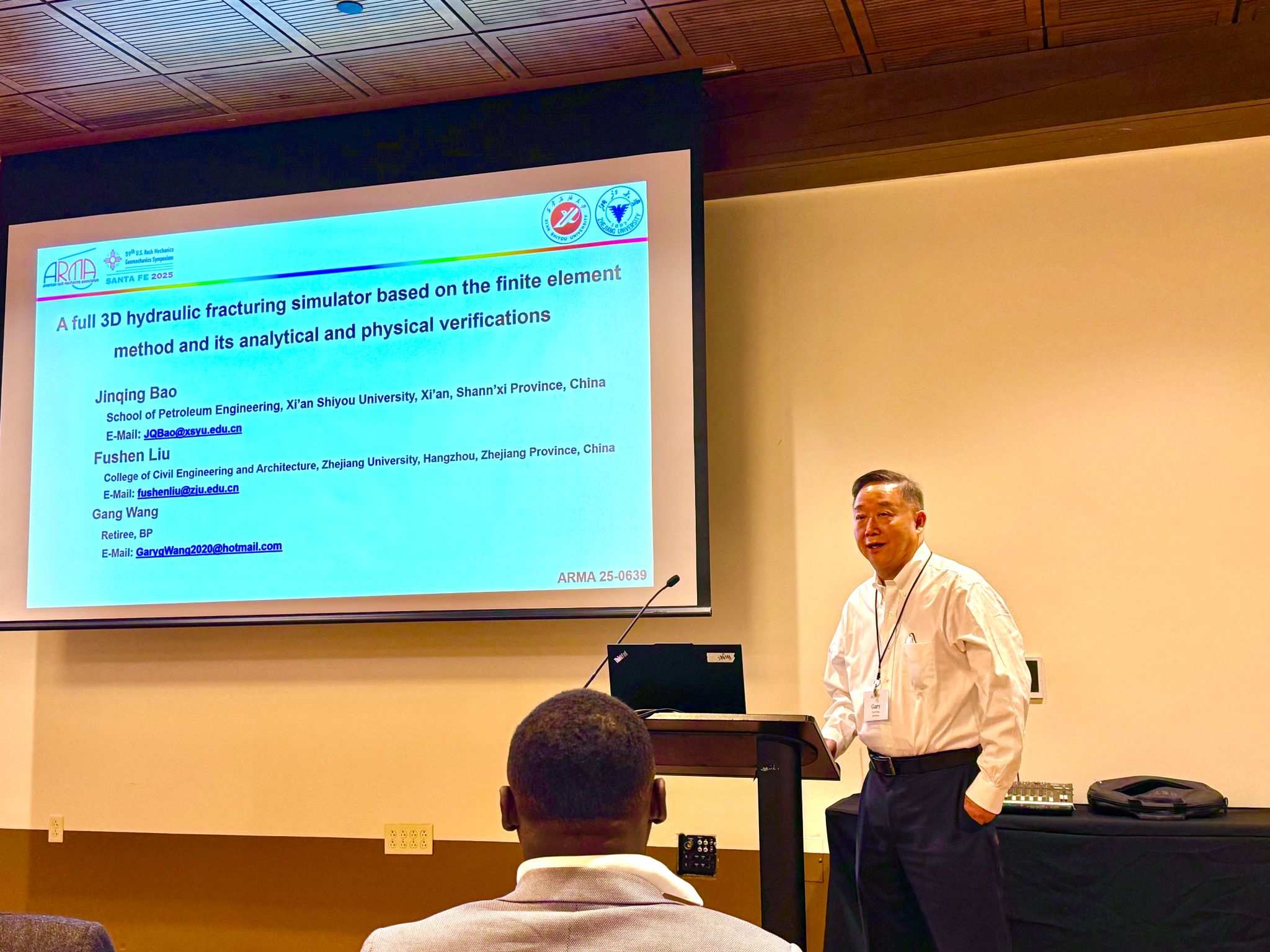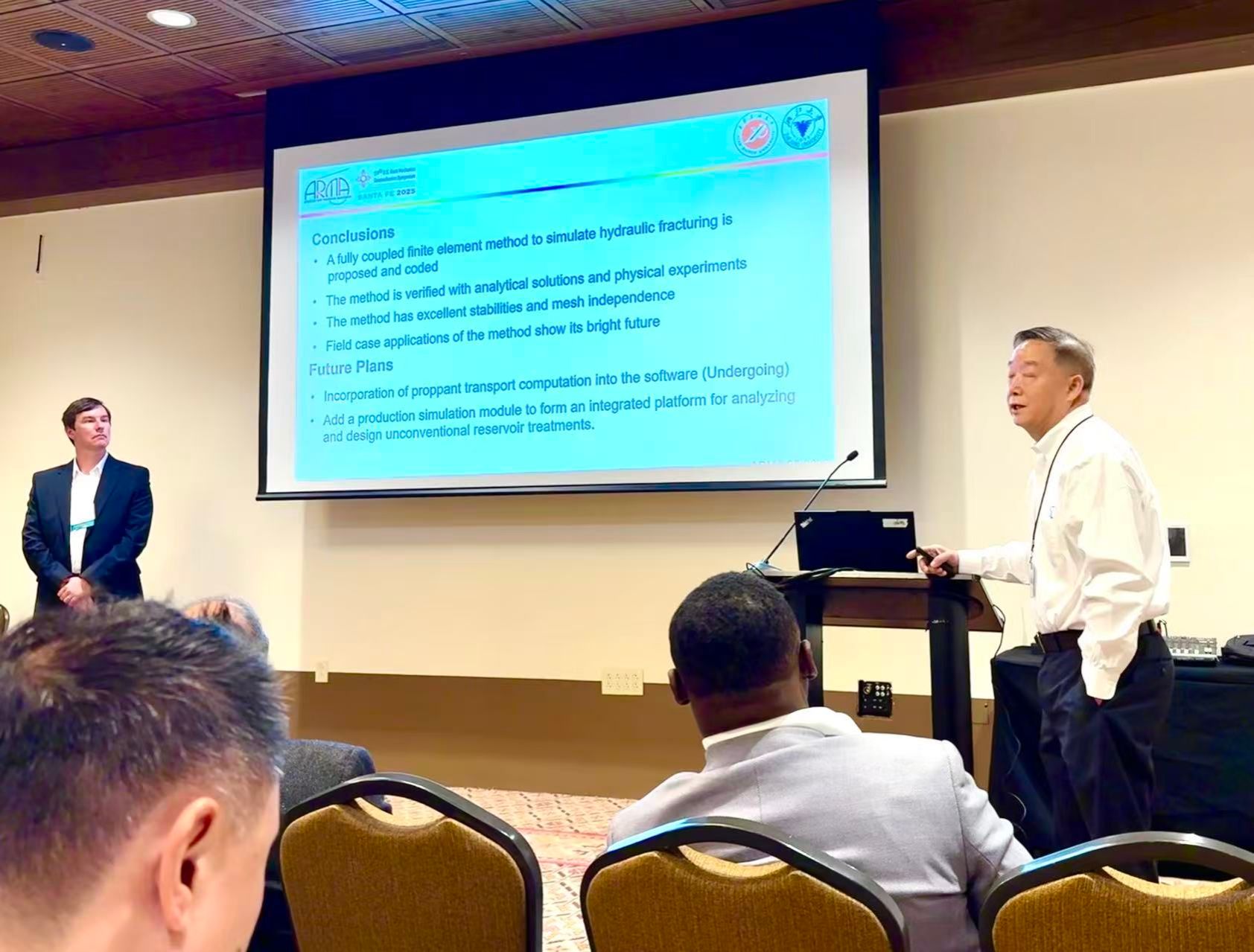 610日,公司包劲青老师科研团队参加了2025年美国岩石力学与地质力学大会,并在非常规石油岩石力学分会场作“A full 3D hydraulic fracturing simulator based on the finite element method and its analytical and physical verifications”专题研究报告。