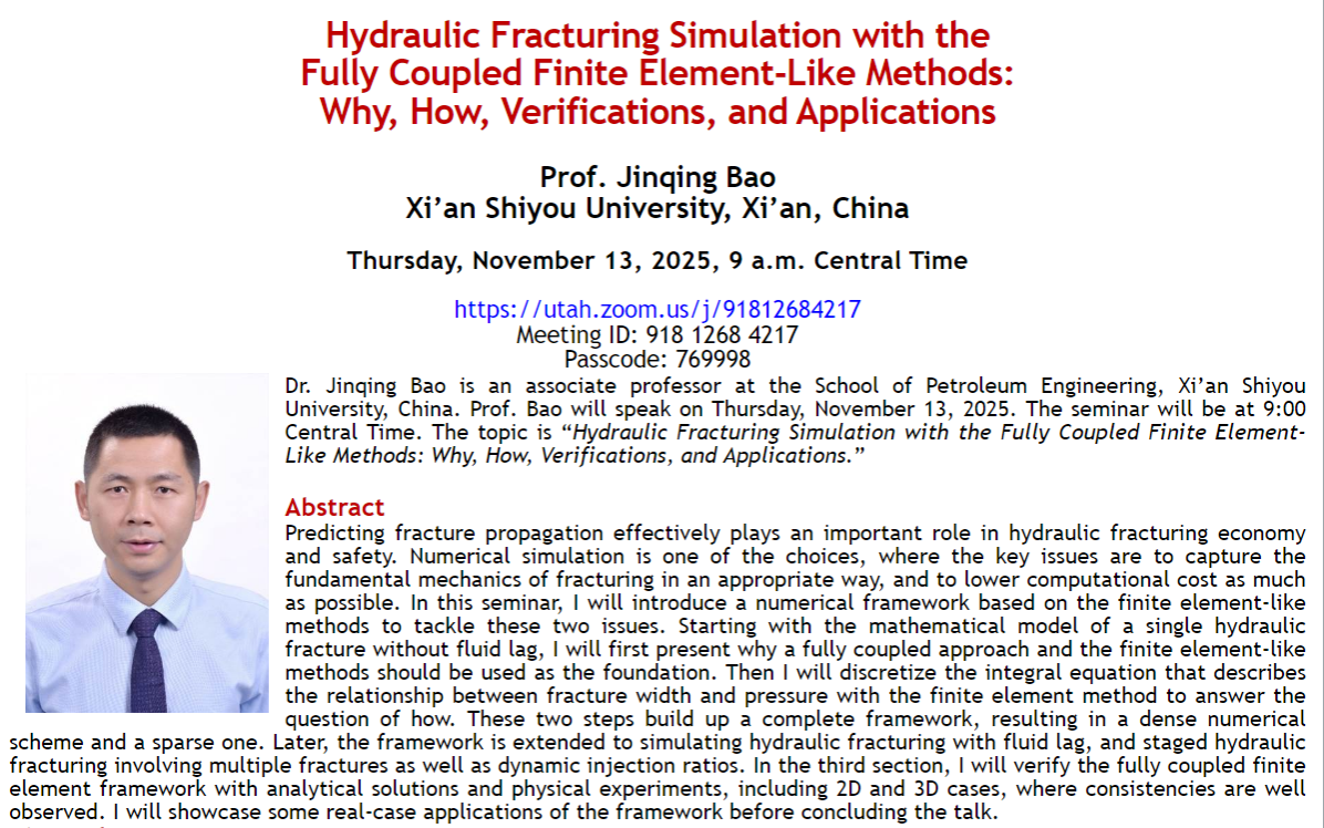 1113日,公司包劲青教授应美国岩石力学学会(American Rock Mechanics Association, ARMA)水力压裂分会的邀请,作在线国际学术报告。包劲青教授的报告题目为Hydraulic Fracturing Simulation with the Finite Element-Like Methods: Why, How, Verifications, and Applications