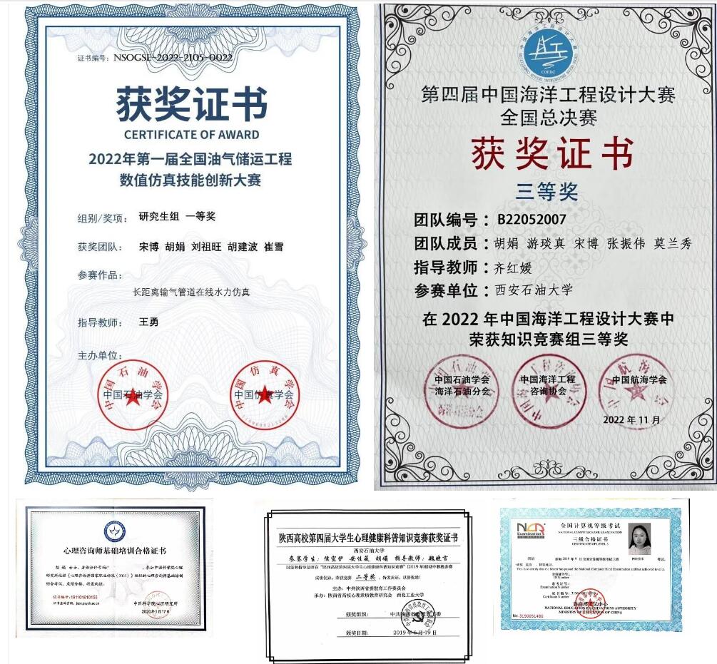 研究生期间,曾获一等学业奖学金,被评为优秀党员、陕西省自强之星标兵。曾获第一届全国油气储运工程数值仿真技能创新大赛研究生组一等奖、第四届中国海洋工程设计大赛全国决赛知识竞赛组三等奖等奖项。