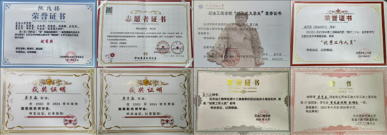 20232024年国家励志奖学金;20222023年国家励志奖学金;“铁人式老员工”称号; 挑战杯校级优秀奖;2024年暑期社会实践优秀个人;院员工会“优秀工作人员”。
