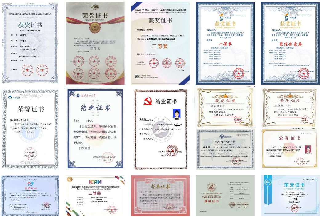 她曾获2项国家级奖项,9项省部级奖项,30余项校级奖项;多次参与社会实际、志愿活动,多次获“标兵团队”、“优秀志愿者”称号。