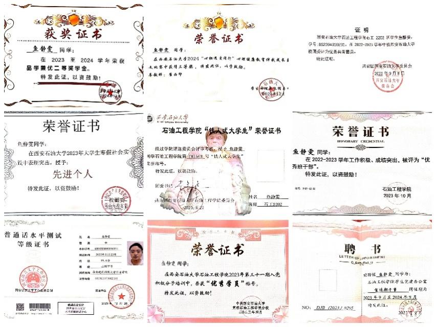 鱼静雯,女,汉族,出生于20043月,陕西咸阳人,中共党员,z6mg人生就是博官网2022级石油工程专业2202班员工。现任班级团支书,曾任公司融媒体中心副主任。现已成功保研至z6mg人生就是博官网攻读硕士研究生。