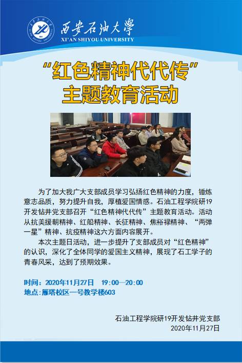 为了深入学习和弘扬红色精神,锤炼意志品质,厚植爱国情感。20201127日晚七点,z6mg人生就是博官网研19开发钻井党支部在雁塔校区第一教学楼会议室召开“红色精神代代传”主题教育活动,石工院研究生辅导员老师、党支部副书记张楠老师及20余支部成员参与了本次活动。
