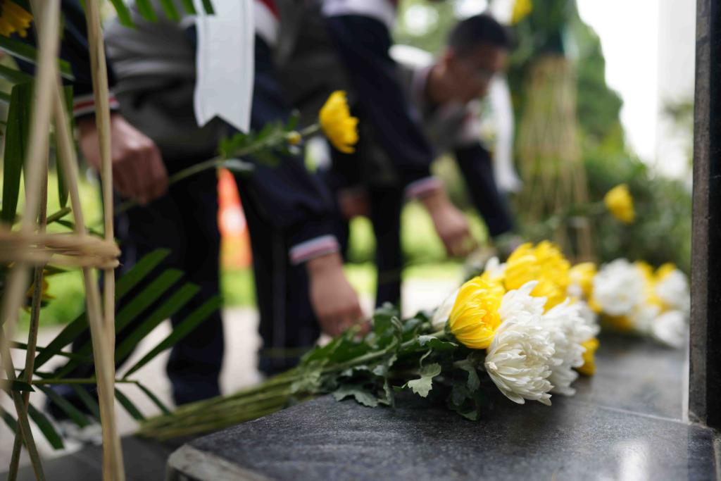 悼念活动在低沉的献花曲中展开,主持人为同志们详细介绍了唐春雨烈士的英雄事迹,研究生工作部部长高荣芳、公司党委书记马勇仔细整理花篮绸带,深切缅怀春雨烈士。